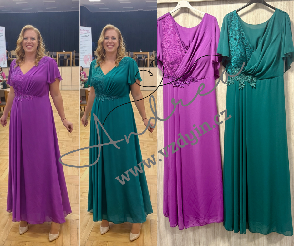 Nádherné dlouhé šaty na větší postavu - sednou 2XL, 3XL - vzadu žabičky překryté přehozem, který je součástí rukávu