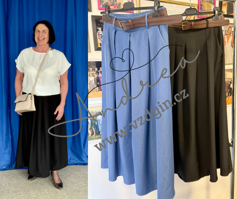 Vepředu skládaná - krásně sedne - pas 35 až 50cm, v místě kapes 80 až 85cm, délka 87cm